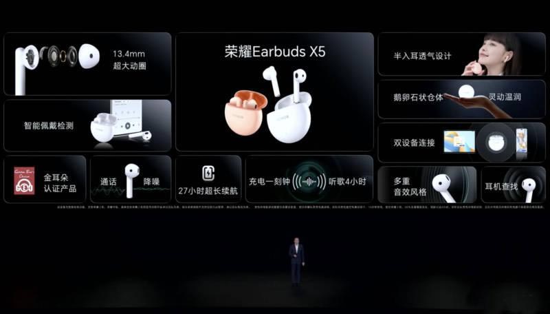 發(fā)布會(huì)上,榮耀還帶了一款Earbuds X5耳機(jī)新品,采用了鵝卵石狀倉(cāng)體,提供釉白色和珊瑚粉兩款配色。耳機(jī)采用了半入耳設(shè)計(jì),單只僅重3.8g,帶來(lái)空氣感舒適佩戴體驗(yàn)。Earbuds X5采用了13.4mm動(dòng)圈單元,復(fù)合鍍鈦振膜,呈現(xiàn)純正音質(zhì),并通過(guò)金耳朵產(chǎn)品認(rèn)證。Earbuds X5提供了27小時(shí)超長(zhǎng)續(xù)航,充電一刻鐘,可以支持4小時(shí)聽(tīng)歌體驗(yàn)。